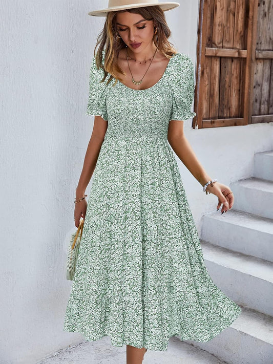 Summer Smocked Midi Dress Ditsy Floral Print Casual a Line Square Neck Short Puff Sleeve Dress